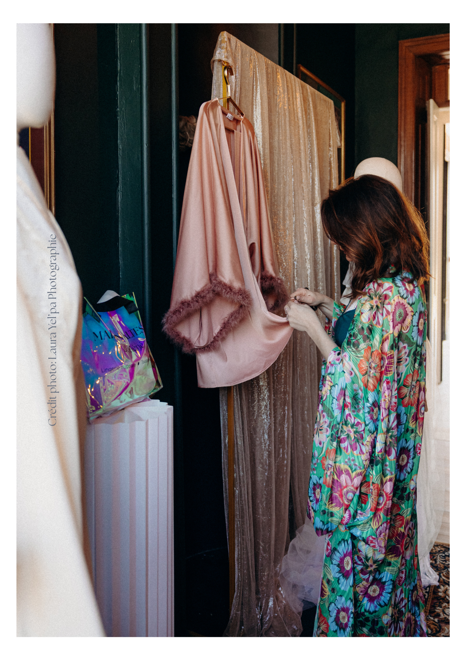 Certaines créations sont également ponctuées de bijoux amovibles, pensés comme des ornements à porter sur la pièce puis à conserver ensuite. Comme un souvenir discret, précieux, qui prolonge le moment au-delà du vêtement lui-même.